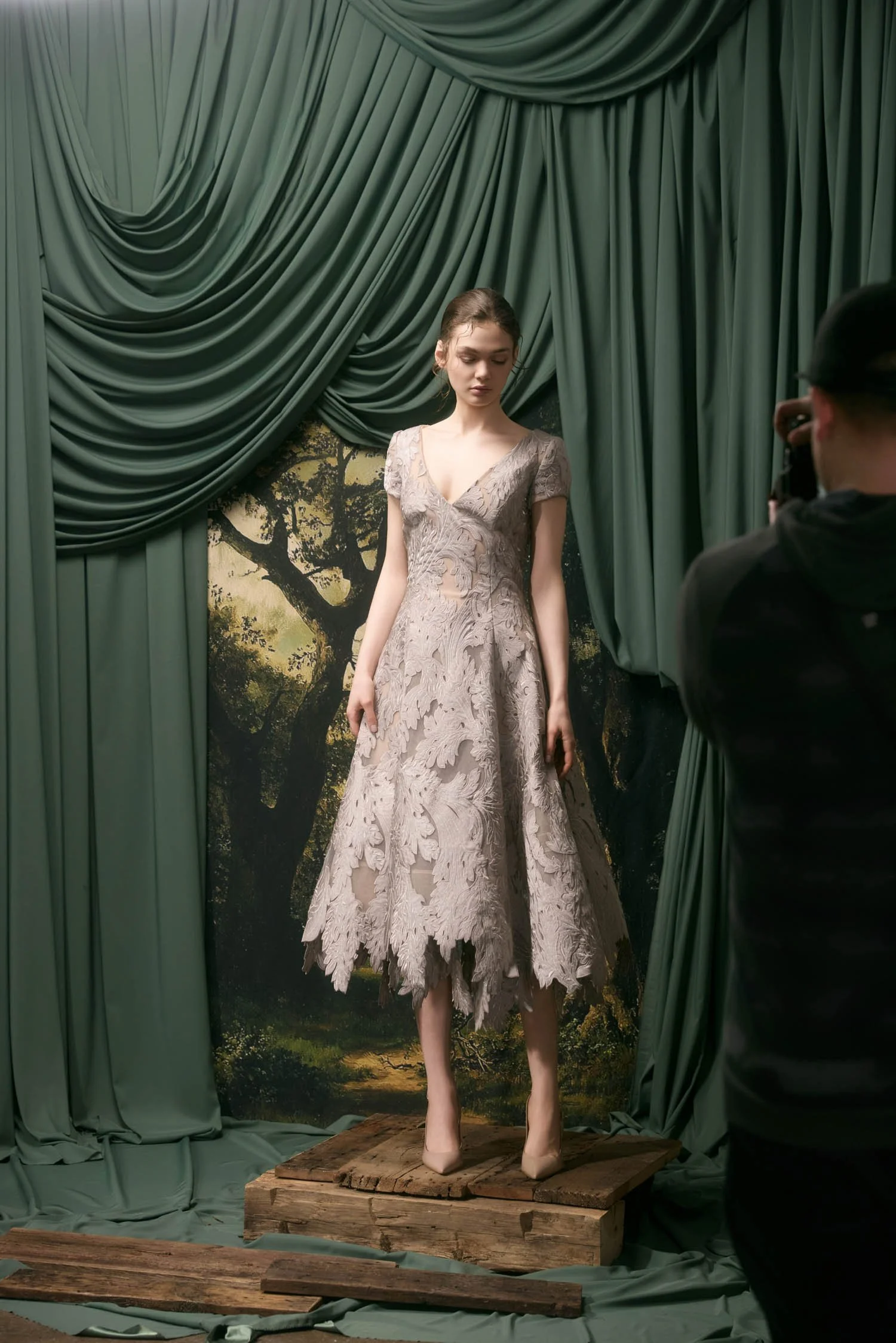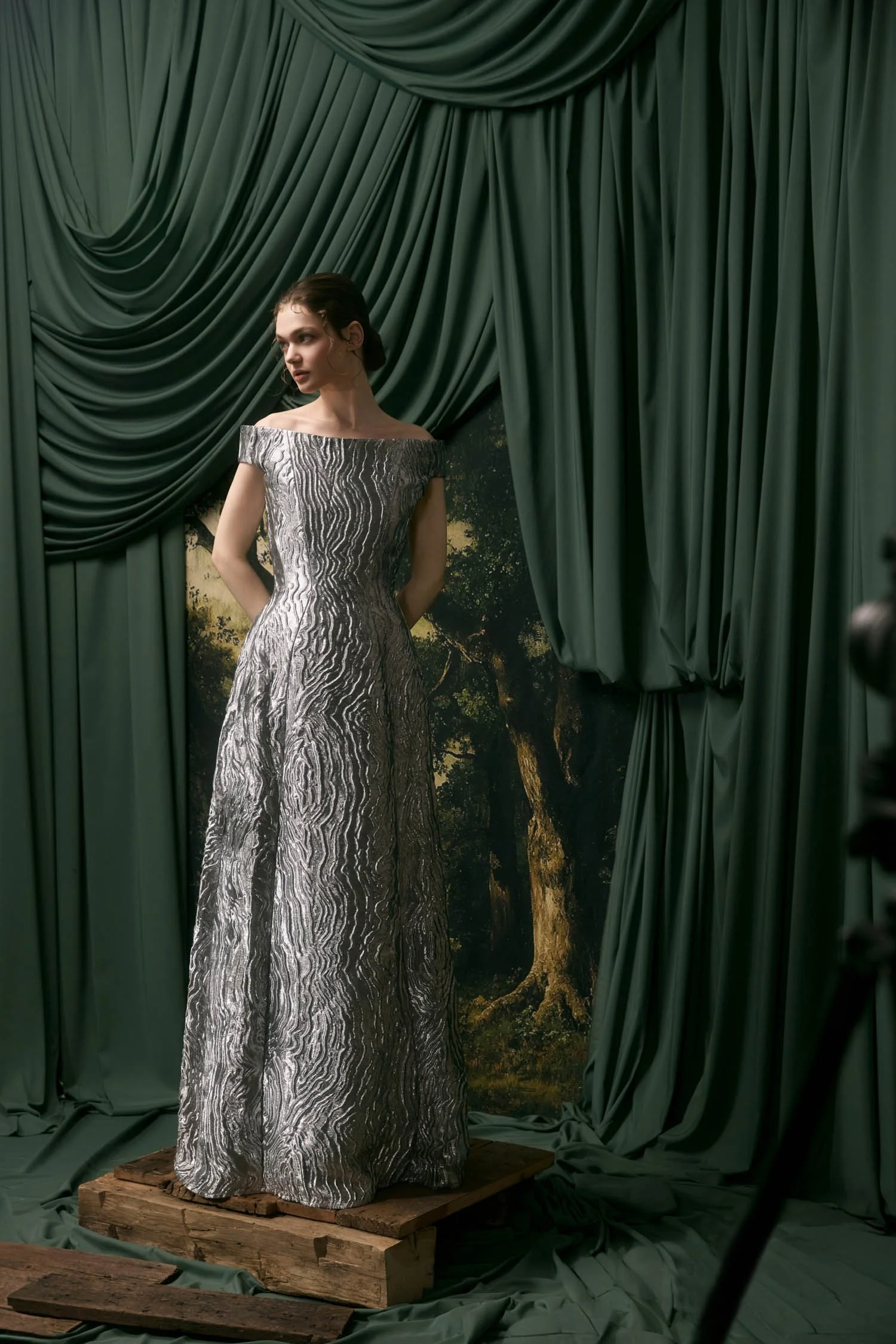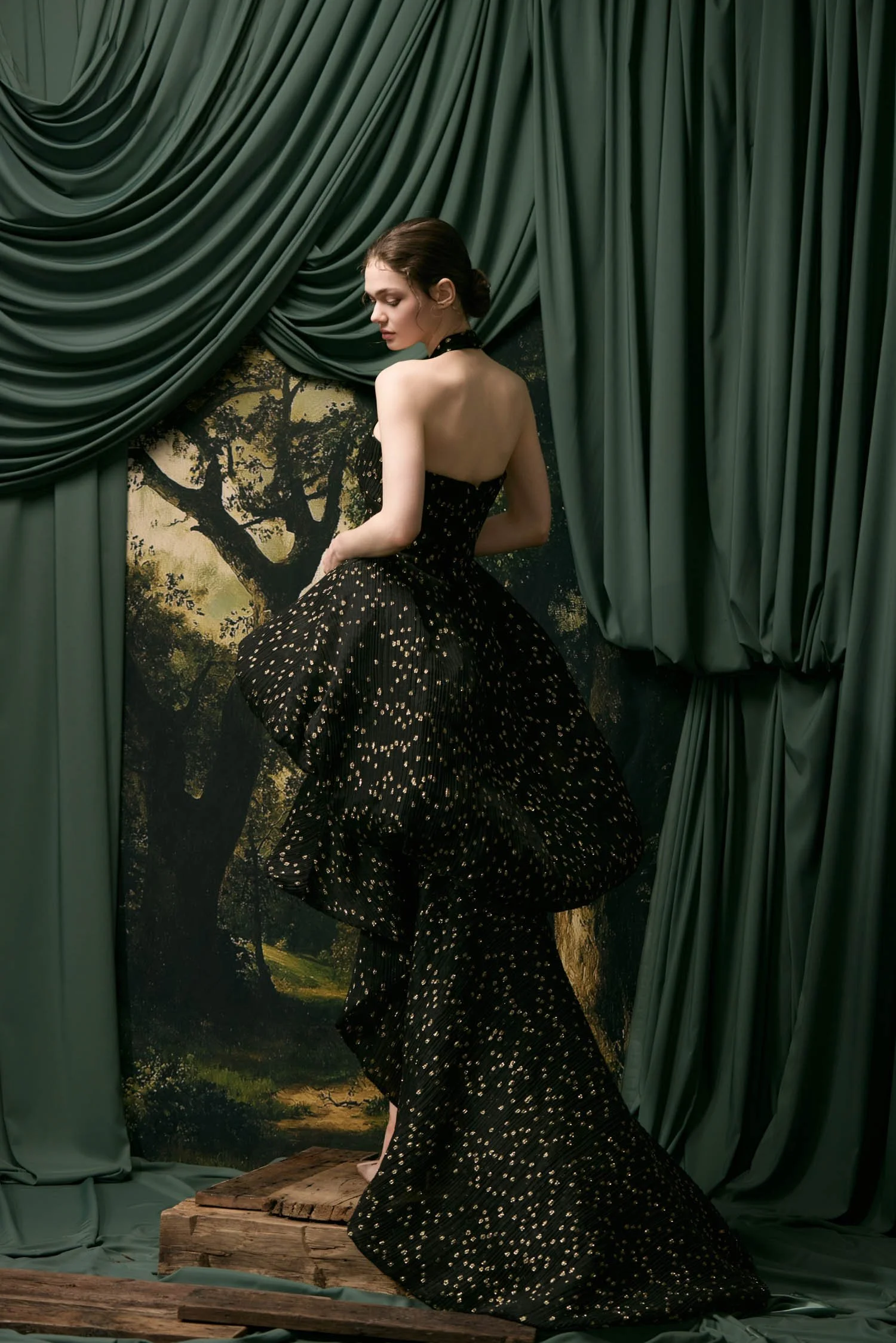 Where liquid satin drapes and delicate silk organza florals meet dramatic silhouettes, illuminated by whispers of pure silver and golden dust, and finished with the signature sparkle of hand-applied crystals.
